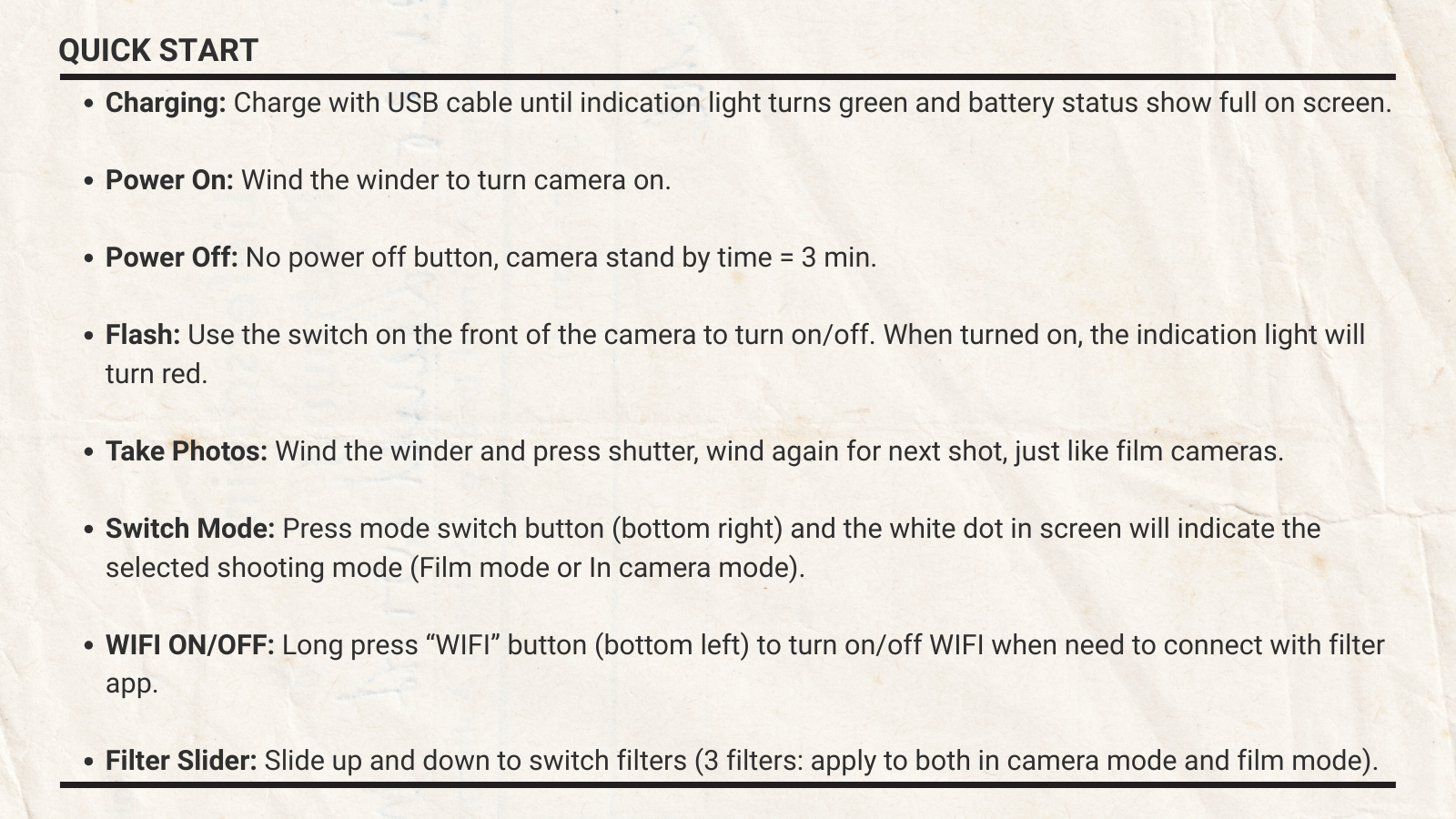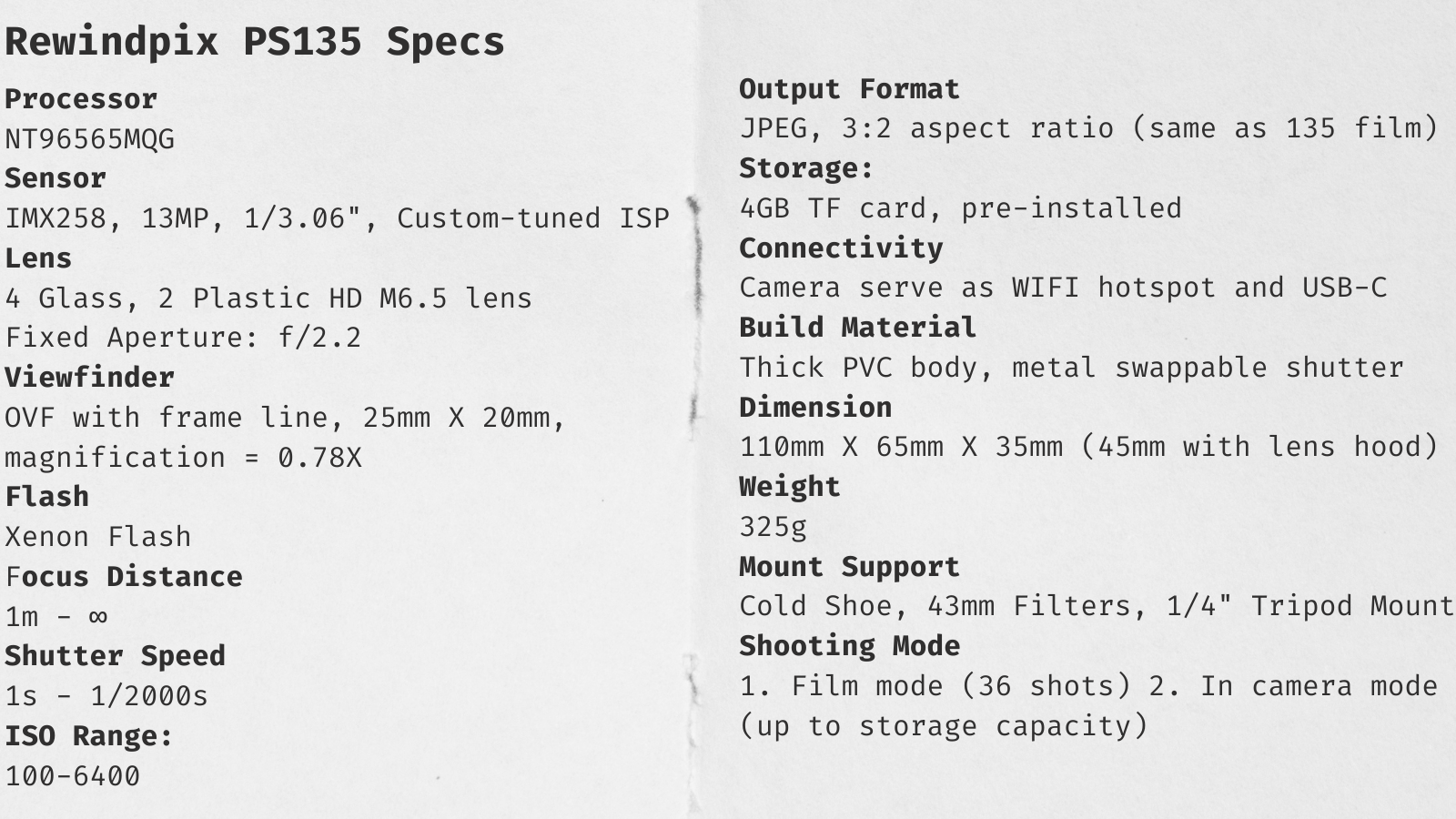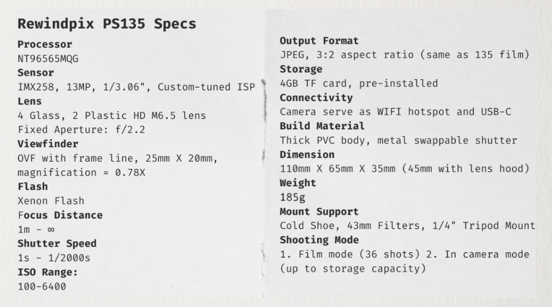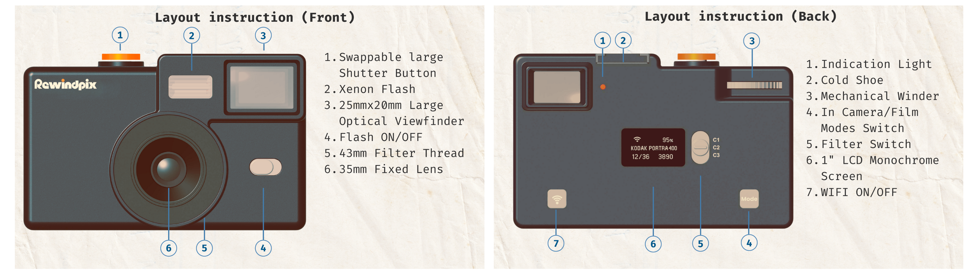 A: Higher specs (Viewfinder, Lens, Sensor, Processor) and the innovative Rewindpix filter app differentiate Rewindpix from competing cameras. Once you hold it in your hands, you will immerse yourself in the cinematic viewfinder, the intuitive operation, the image quality, and most importantly, the film vibes that you have full control over